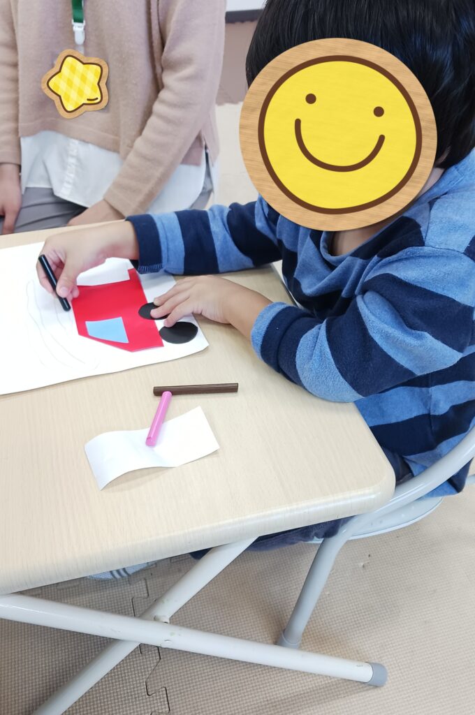 午後の制作では、折り紙や色鉛筆を使って「消防車制作」を行い、